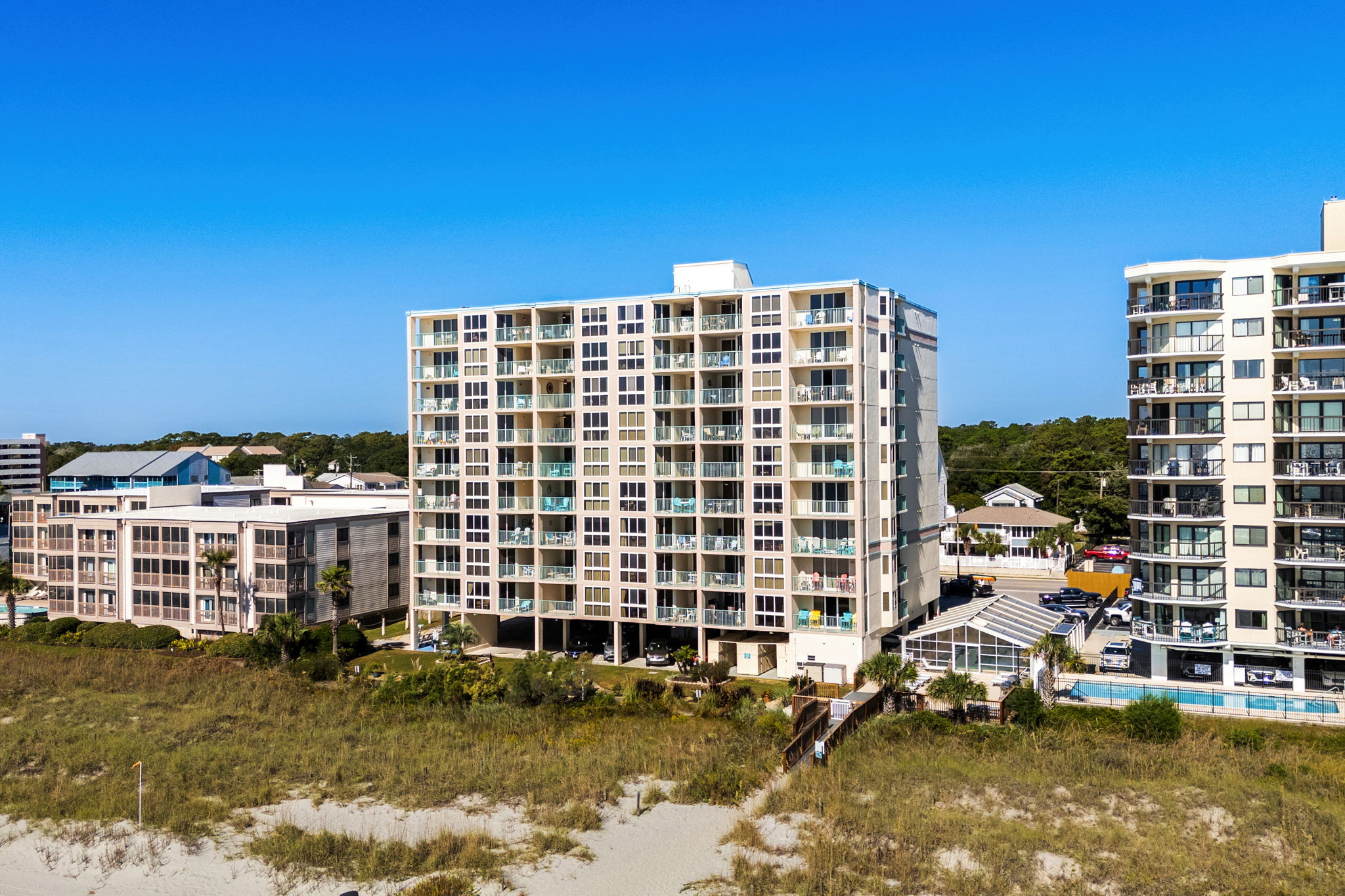 Reserve a 2 or 3 bedroom condo at The Pinnacle that comes with a fully equipped kitchen and comfortable living accommodations for your vacation stay. Take a rest from your worries at The Pinnacle while listening to the breaking waves as you soak up the Carolina sunshine. Take a stroll along the shoreline to find the perfect seashell and maybe even come across a shark’s tooth or two. Get out of the heat and take a dip in the enclosed pool at The Pinnacle.